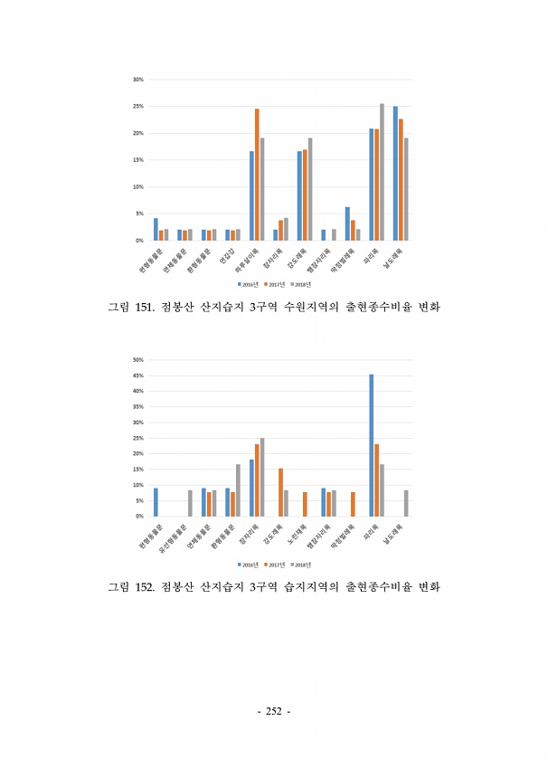 252 그림 151. 점봉산 산지습지 3구역 수원지역의 출현종수비율 변화 그림 152. 점봉산 산지습지 3구역 습지지역의 출현종수비율변화