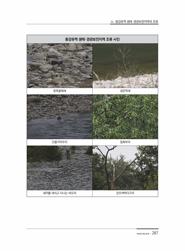 iv. 동강유역 생태·경관보전지역의 조류 www.nie.re.kr ?287 동강유역 생태·경관보전지역 조류 사진 흰목물떼새 검은딱새 민물가마우지 밀화부리 새끼를 데리고 다니는 비오리큰오색딱다구리