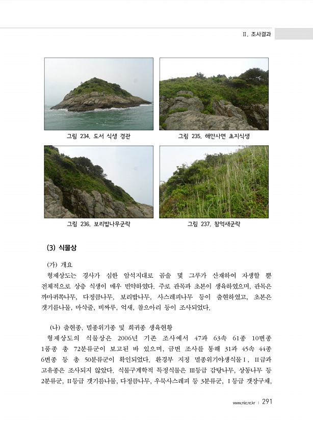 Ⅱ. 조사결과 www.nie.re.kr ? 291 그림 234. 도서 식생 경관 그림 235. 해안사면 초지식생 그림 236. 보리밥나무군락 그림 237. 참억새군락 3 식물상 가 개요 형제상도는 경사가 심한 암석지대로 곰솔 몇 그루가 산재하여 자생할 뿐 전체적으로 상층 식생이 매우 빈약하였다. 주로 관목과 초본이 생육하였으며, 관목은 까마귀쪽나무, 다정큼나무, 보리밥나무, 사스레피나무 등이 출현하였고, 초본은 갯기름나물, 마삭줄, 비짜루, 억새, 참으아리 등이 조사되었다. 나 출현종, 멸종위기종 및 희귀종 생육현황 형제상도의 식물상은 2006년 기존 조사에서 47과 63속 61종 10변종 1품종 총 72분류군이 보고된 바 있으며, 금번 조사를 통해 31과 45속 44종 6변종 등 총 50분류군이 확인되었다...