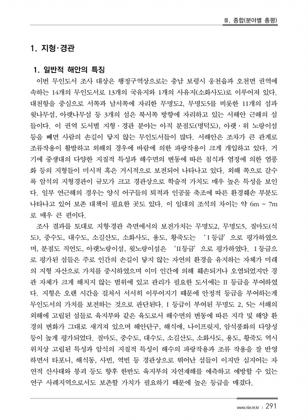 Ⅲ. 종합 분야별 총평 www.nie.re.kr ? 291 1. 지형?경관 1. 일반적 해안의 특징 이번 무인도서 조사 대상은 행정구역상으로는 충남 보령시 웅천읍과 오천면 권역에 속하는 14개의 무인도서로 13개의 국유지와 1개의 사유지 소화사도 로 이루어져 있다. 대천항을 중심으로 서쪽과 남서쪽에 자리한 무명도2, 무명도5를 비롯한 11개의 섬과 윗나무섬, 아랫나무섬 등 3개의 섬은 북서쪽 방향에 자리하고 있는 서해안 근해의 섬 들이다. 이 권역 도서별 지형·경관 분야는 아직 분점도 명덕도 , 아랫·위 노랑이섬 등을 빼면 사람의 손길이 닿지 않는 무인도서들이 많다. 서해안은 조차가 큰 관계로 조류작용이 활발하고 외해의 경우에 바람에 의한 파랑작용이 크게 개입하고 있다. 거 기에 중생대의 다양한 지질적 특성...