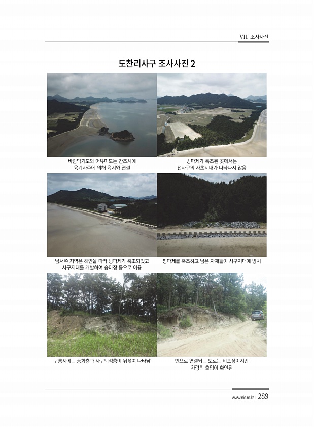 VII. 조사사진 www.nie.re.kr ?289 바람막기도와 어유미도는 간조시에 육계사주에 의해 육지와 연결 방파제가 축조된 곳에서는 전사구의 사초지대가 나타나지 않음 남서쪽 지역은 해안을 따라 방파제가 축조되었고 사구지대를 개발하여 승마장 등으로 이용 팡파제를 축조하고 남은 자재들이 사구지대에 방치 구릉지에는 풍화층과 사구퇴적층이 뒤섞여 나타남 빈으로 연결되는 도로는 비포장이지만 차량의 출입이 확인된2