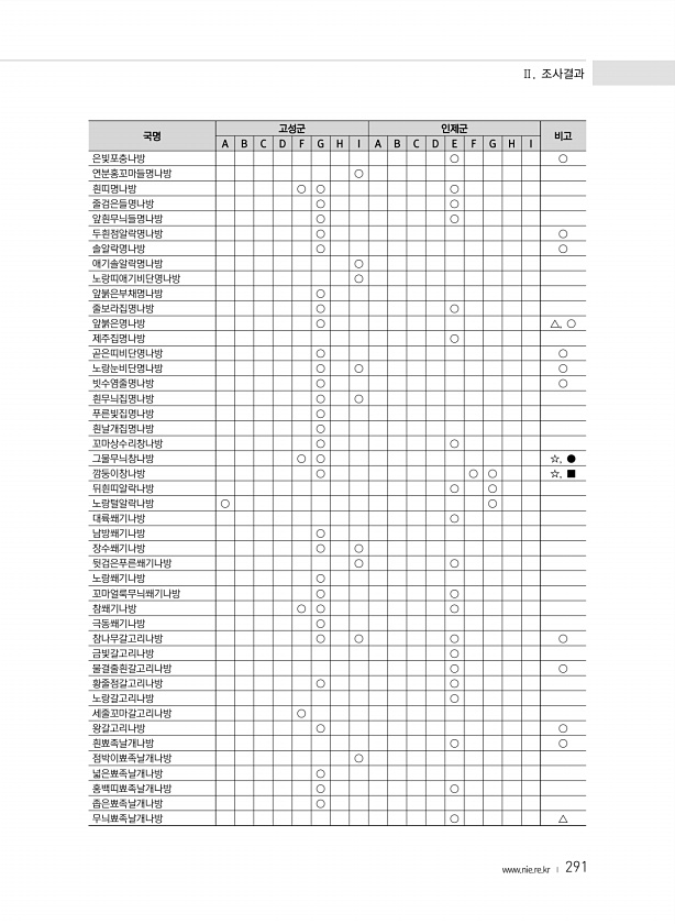 Ⅱ. 조사결과 www.nie.re.kr ? 291 국명 고성군 인제군 비고 A B C D F G H I A B C D E F G H I 은빛포충나방 ○ ○ 연분홍꼬마들명나방 ○ 흰띠명나방 ○ ○ ○ 줄검은들명나방 ○ ○ 앞흰무늬들명나방 ○ ○ 두흰점알락명나방 ○ ○ 솔알락명나방 ○ ○ 애기솔알락명나방 ○ 노랑띠애기비단명나방 ○ 앞붉은부채명나방 ○ 줄보라집명나방 ○ ○ 앞붉은명나방 ○ △, ○ 제주집명나방 ○ 곧은띠비단명나방 ○ ○ 노랑눈비단명나방 ○ ○ ○ 빗수염줄명나방 ○ ○ 흰무늬집명나방 ○ ○ 푸른빛집명나방 ○ 흰날개집명나방 ○ 꼬마상수리창나방 ○ ○ 그물무늬창나방 ○ ○ ☆, ● 깜둥이창나방 ○ ○ ○ ☆, ■ 뒤흰띠알락나방 ○ ○ 노랑털알락나방 ○ ○ 대륙쐐기나방 ○ 남방쐐기나방 ○ 장수쐐기나방 ○...