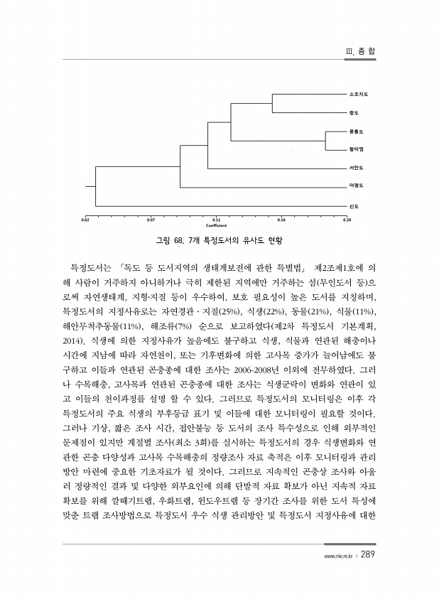 Ⅲ. 종 합 www.nie.re.kr ? 289 그림 68. 7개 특정도서의 유사도 현황 특정도서는 「독도 등 도서지역의 생태계보전에 관한 특별법」 제2조제1호에 의 해 사람이 거주하지 아니하거나 극히 제한된 지역에만 거주하는 섬 무인도서 등 으 로써 자연생태계, 지형?지질 등이 우수하여, 보호 필요성이 높은 도서를 지칭하며, 특정도서의 지정사유로는 자연경관·지질 25% , 식생 22% , 동물 21% , 식물 11% , 해안무척추동물 11% , 해조류 7% 순으로 보고하였다 제2차 특정도서 기본계획, 2014 식생에 의한 지정사유가 높음에도 불구하고 식생, 식물과 연관된 해충이나 시간에 지남에 따라 자연천이, 또는 기후변화에 의한 고사목 증가가 늘어남에도 불 구하고 이들과 연관된 곤충종에 대한 조사는 20...