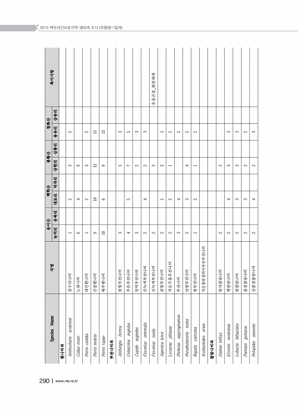 2016 백두대간보호지역 생태계 조사 추풍령밀재 290Ⅰwww.nie.re.kr Species Name 국명 웅이산 백학산 봉황산 청화산 특이사항 능치리 웅북리 대포리 덕곡리 상현리 심봉리 용유리 삼송리 흰나비과 Anthocharis scolymus 갈구리나비 1 2 3 5 Colias erate 노랑나비 6 4 9 Pieris canidia 대만흰나비 1 2 3 2 Pieris melete 큰줄흰나비 9 10 12 11 Pieris rapae 배추흰나비 10 6 9 13 부전나비과 Ahlbergia ferrea 쇳빛부전나비 3 5 3 Celastrina argiolus 푸른부전나비 4 5 7 5 Cupido argiades 암먹부전나비 3 2 3 Favonius orientalis 큰녹색부전나비 2 4 2...