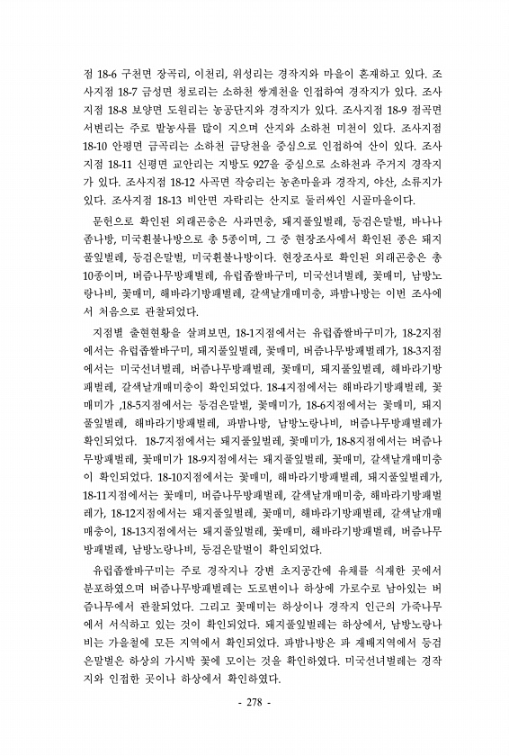 점 18-6 구천면 장곡리, 이천리, 위성리는 경작지와 마을이 혼재하고 있다. 조 사지점 18-7 금성면 청로리는 소하천 쌍계천을 인접하여 경작지가 있다. 조사 지점 18-8 보양면 도원리는 농공단지와 경작지가 있다. 조사지점 18-9 점곡면 서변리는 주로 밭농사를 많이 지으며 산지와 소하천 미천이 있다. 조사지점 18-10 안평면 금곡리는 소하천 금당천을 중심으로 인접하여 산이 있다. 조사 지점 18-11 신평면 교안리는 지방도 927을 중심으로 소하천과 주거지 경작지 가 있다. 조사지점 18-12 사곡면 작승리는 농촌마을과 경작지, 야산, 소류지가 있다. 조사지점 18-13 비안면 자락리는 산지로 둘러싸인 시골마을이다. 문헌으로 확인된 외래곤충은 사과면충, 돼지풀잎벌레, 등검은말벌, 바나나 좀나방, 미국...