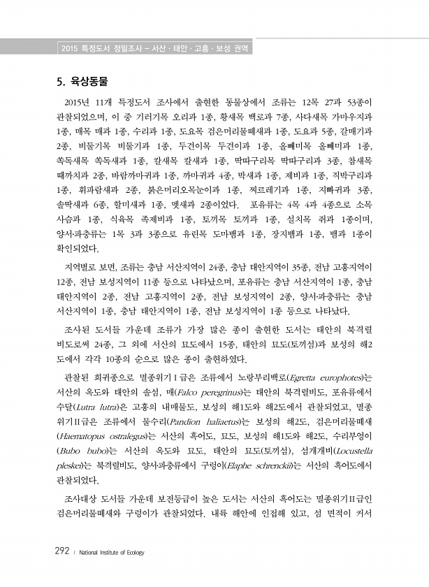 2015 특정도서 정밀조사 서산·태안·고흥·보성 권역 292 ? National Institute of Ecology 5. 육상동물 2015년 11개 특정도서 조사에서 출현한 동물상에서 조류는 12목 27과 53종이 관찰되었으며, 이 중 기러기목 오리과 1종, 황새목 백로과 7종, 사다새목 가마우지과 1종, 매목 매과 1종, 수리과 1종, 도요목 검은머리물떼새과 1종, 도요과 5종, 갈매기과 2종, 비둘기목 비둘기과 1종, 두견이목 두견이과 1종, 올빼미목 올빼미과 1종, 쏙독새목 쏙독새과 1종, 칼새목 칼새과 1종, 딱따구리목 딱따구리과 3종, 참새목 때까치과 2종, 바람까마귀과 1종, 까마귀과 4종, 박새과 1종, 제비과 1종, 직박구리과 1종, 휘파람새과 2종, 붉은머리오목눈이과 1종, 찌르레기과 1종...