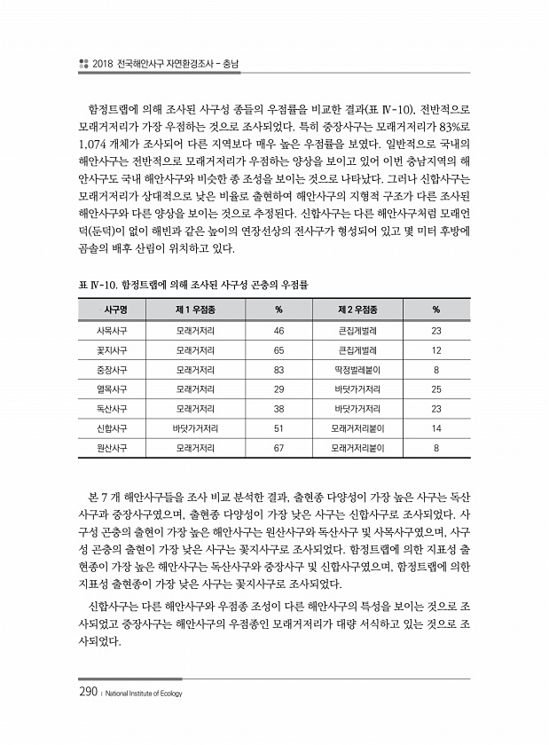 2018 전국해안사구 자연환경조사 충남 290 ? National Institute of Ecology 함정트랩에 의해 조사된 사구성 종들의 우점률을 비교한 결과 표 Ⅳ-10 , 전반적으로 모래거저리가 가장 우점하는 것으로 조사되었다. 특히 중장사구는 모래거저리가 83%로 1,074 개체가 조사되어 다른 지역보다 매우 높은 우점률을 보였다. 일반적으로 국내의 해안사구는 전반적으로 모래거저리가 우점하는 양상을 보이고 있어 이번 충남지역의 해 안사구도 국내 해안사구와 비슷한 종 조성을 보이는 것으로 나타났다. 그러나 신합사구는 모래거저리가 상대적으로 낮은 비율로 출현하여 해안사구의 지형적 구조가 다른 조사된 해안사구와 다른 양상을 보이는 것으로 추정된다. 신합사구는 다른 해안사구처럼 모래언 덕 둔덕 이 없이 해...