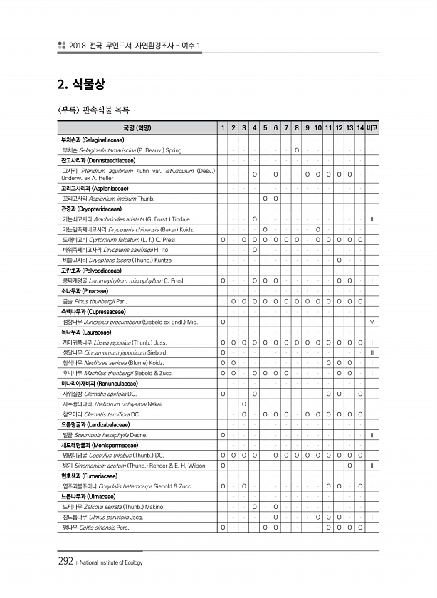 2018 전국 무인도서 자연환경조사 여수 1 292 ? National Institute of Ecology 2. 국명 학명 1 2 3 4 5 6 7 8 9 10 11 12 13 14 비고 부처손과 Selaginellaceae 부처손 Selaginella tamariscina P. Beauv. Spring O 잔고사리과 Dennstaedtiaceae 고사리 Pteridium aquilinum Kuhn var. latiusculum Desv. Underw. ex A. Heller O O O O O O O 꼬리고사리과 Aspleniaceae 꼬리고사리 Asplenium incisum Thunb. O O 관중과 D...