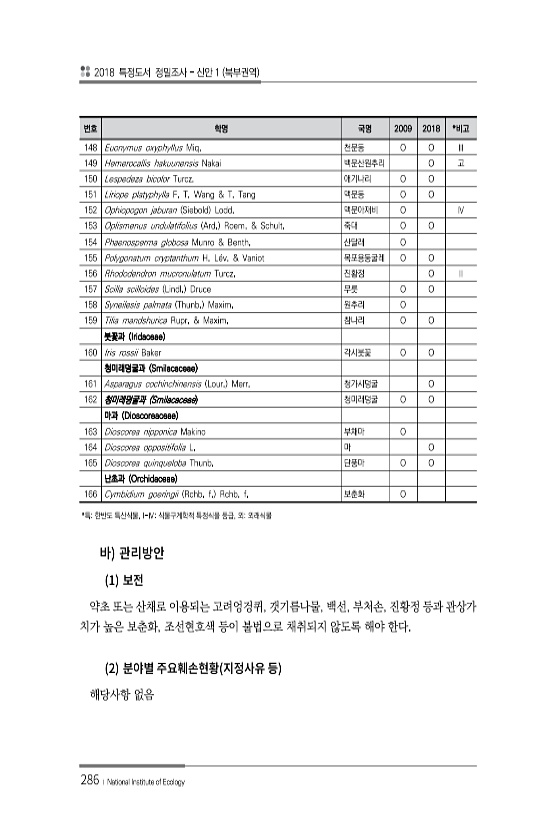 2018 특정도서 정밀조사 신안 1 북부권역 286 ? National Institute of Ecology *특한반도 특산식물, I-Ⅳ식물구계학적 특정식물 등급, 외외래식물 1 약초 또는 산채로 이용되는 고려엉겅퀴, 갯기름나물, 백선, 부처손, 진황정 등과 관상가 치가 높은 보춘화, 조선현호색 등이 불법으로 채취되지 않도록 해야 한다. 2 해당사항 없음 번호 학명 국명 2009 2018 *비고 148 Euonymus oxyphyllus Miq. 천문동 O O Ⅲ 149 Hemerocallis hakuunensis Nakai 백운산원추리 O 고 150 Lespedeza bicolor Turcz. 애기나리 O O 151 Liriope platyphylla F. T. Wang & T. Tang 맥문동 O O 1...