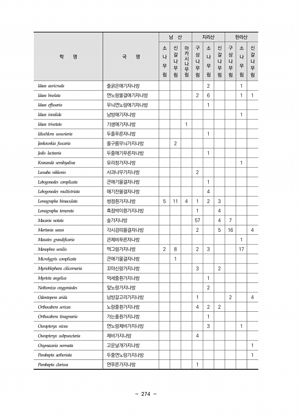 274 학 명 국 명 남 산 지리산 한라산 소 나 무 림 신 갈 나 무 림 아카시나무림 구 상 나 무 림 소 나 무 림 신 갈 나 무 림 구 상 나 무 림 소 나 무 림 신 갈 나 무 림 Idaea auricruda 줄굵은애기자나방 2 1 Idaea biselata 연노랑물결애기자나방 2 6 1 1 Idaea effusaria 무늬연노랑애기자나방 1 Idaea invalida 남방애기자나방 1 Idaea trisetata 기생애기자나방 1 Idiochlora ussuriaria 두줄푸른자나방 1 Jankowskia fuscaria 줄구름무늬가지나방 2 Jodis lactearia 두줄애기푸른자나방 1 Krananda semihyalina 유리창가지나방 1 Lassaba nikkonis 사과나무가지나방 2 L...