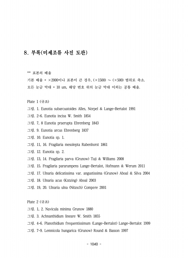 1040 8. 부록 미세조류 사진 도판 ** 표본의 배율 기본 배율 = ×2000이나 표본이 큰 경우, ×1500 ∼ ×500 범위로 축소. 모든 눈금 막대 = 10 um, 해당 번호 위의 눈금 막대 이외는 공통 배율. Plate 1 규조 그림. 1. Eunotia subarcuatoides Alles, N?rpel & Lange-Bertalot 1991 그림. 2-6. Eunotia incisa W. Smith 1854 그림. 7, 8 Eunotia praerupta Ehrenberg 1843 그림. 9. Eunotia arcus Ehrenberg 1837 그림. 10. Eunotia sp. 1. 그림. 11, 16. Fragilaria mesolepta Rabenhorst 1861 그림. 12. Euno...