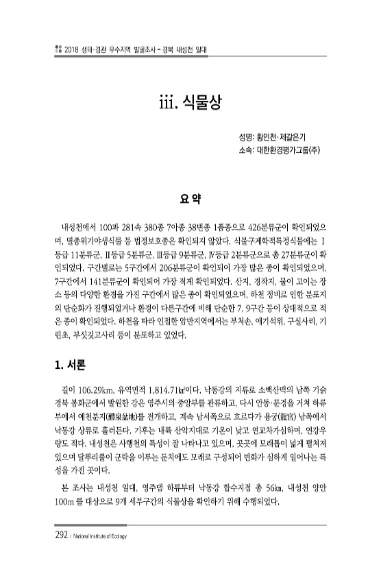 2018 생태·경관 우수지역 발굴조사 경북 내성천 일대 292 ? National Institute of Ecology iii. 성명황인천·제갈은기 소속대한환경평가그룹 주 내성천에서 100과 281속 380종 7아종 38변종 1품종으로 426분류군이 확인되었으 며, 멸종위기야생식물 등 법정보호종은 확인되지 않았다. 식물구계학적특정식물에는 Ⅰ 등급 11분류군, Ⅱ등급 5분류군, Ⅲ등급 9분류군, Ⅳ등급 2분류군으로 총 27분류군이 확 인되었다. 구간별로는 5구간에서 206분류군이 확인되어 가장 많은 종이 확인되었으며, 7구간에서 141분류군이 확인되어 가장 적게 확인되었다. 산지, 경작지, 물이 고이는 장 소 등의 다양한 환경을 가진 구간에서 많은 종이 확인되었으며, 하천 정비로 인한 분포지 의 단순화가 진행...