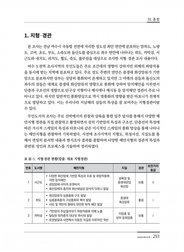III. 종 합 www.nie.re.kr ?293 1. ? 본 조사는 전남 여수시 국동항 전면에 자리한 경도섬 좌안 연안에 분포하는 암목도, 노량 도, 고여, 초도, 부도, 소죽도와 돌산도를 중심으로 좌우 연안에 나타나는 취도, 까막섬, 서 근도와 내치도, 외치도, 혈도, 죽도, 볼무섬을 대상으로 조사한 지형·경관 조사 내용이다. 여수 3 권역 조사지역의 무인도들은 주로 조간대의 영향이 강하지만 외해의 파랑작용 을 동시에 받는 지역에 분포하고 있다. 주로 경도 주변의 연안은 중생대 화강암류가 기반 암으로 분포하지만 상부는 상당히 풍화되어 존재하고 있지만 그 아래의 섬들과 돌산도의 좌우의 섬들은 대체로 중생대 화산암류의 영향으로 풍화에 강하여 암석해안을 이루면서 단층과 구조선의 영향으로 단구상 지형이나 해식애...