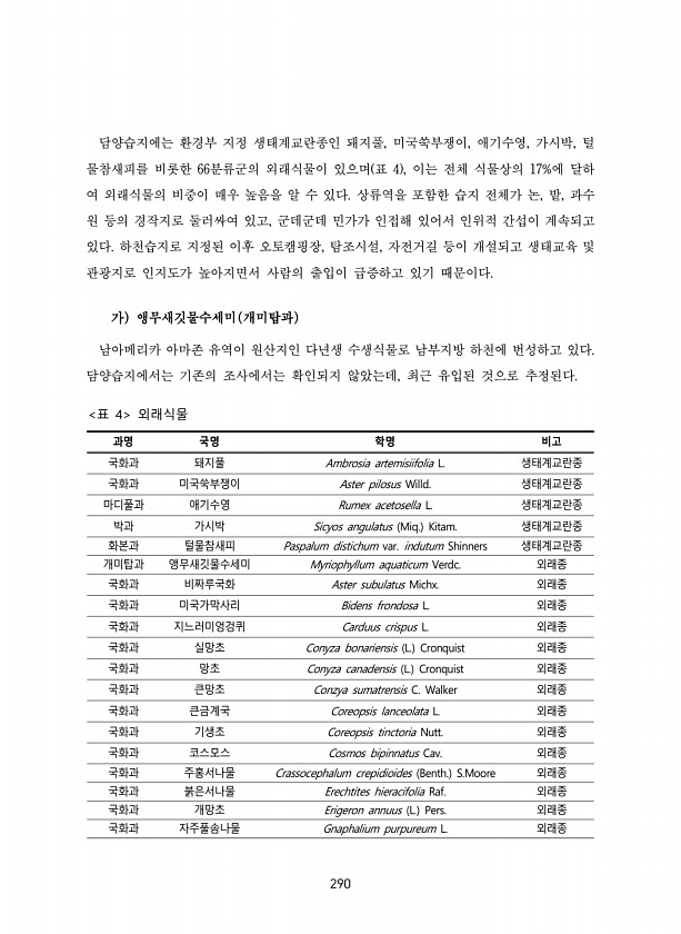 290 담양습지에는 환경부 지정 생태계교란종인 돼지풀, 미국쑥부쟁이, 애기수영, 가시박, 털 물참새피를 비롯한 66분류군의 외래식물이 있으며 표 4 , 이는 전체 식물상의 17%에 달하 여 외래식물의 비중이 매우 높음을 알 수 있다. 상류역을 포함한 습지 전체가 논, 밭, 과수 원 등의 경작지로 둘러싸여 있고, 군데군데 민가가 인접해 있어서 인위적 간섭이 계속되고 있다. 하천습지로 지정된 이후 오토캠핑장, 탐조시설, 자전거길 등이 개설되고 생태교육 및 관광지로 인지도가 높아지면서 사람의 출입이 급증하고 있기 때문이다. 가 앵무새깃물수세미 개미탑과 남아메리카 아마존 유역이 원산지인 다년생 수생식물로 남부지방 하천에 번성하고 있다. 담양습지에서는 기존의 조사에서는 확인되지 않았는데, 최근 유입된 것으로 추정된다...