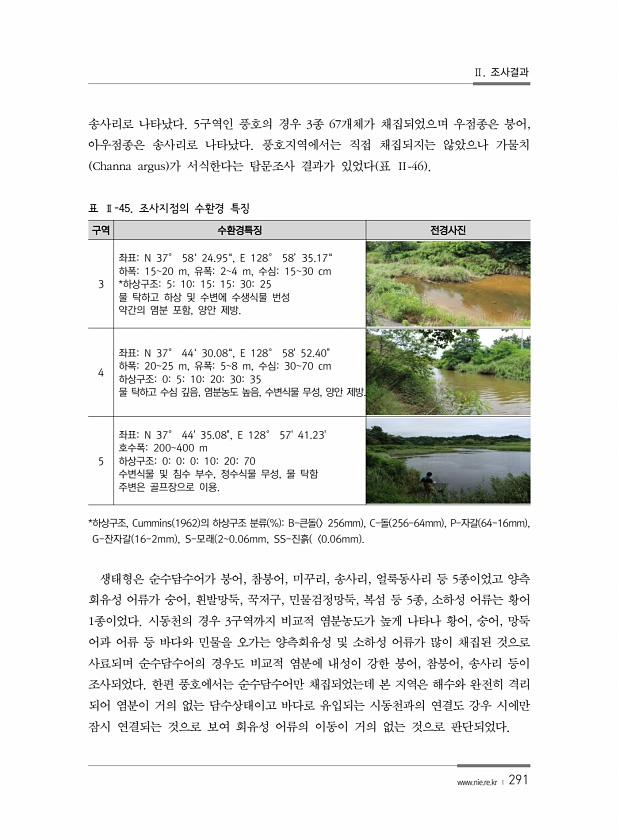 Ⅱ. 조사결과 www.nie.re.kr ? 291 송사리로 나타났다. 5구역인 풍호의 경우 3종 67개체가 채집되었으며 우점종은 붕어, 아우점종은 송사리로 나타났다. 풍호지역에서는 직접 채집되지는 않았으나 가물치 Channa argus 가 서식한다는 탐문조사 결과가 있었다 표 Ⅱ-46 표 Ⅱ-45. 조사지점의 수환경 특징 구역 수환경특징 전경사진 3 좌표N 37° 58‘ 24.95“, E 128° 58’ 35.17“ 하폭1520 m, 유폭24 m, 수심1530 cm *하상구조51015153025 물 탁하고 하상 및 수변에 수생식물 번성 약간의 염분 포함, 양안 제방. 4 좌표N 37° 44‘ 30.08“, E 128° 5852.40하폭2025 m, 유폭58 m, 수심3070 cm 하상구조0510203035 ...