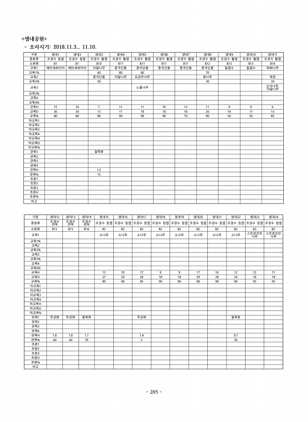 샘내공원 조사시기2018.11.3., 11.10. 구분 샘내1 샘내2 샘내3 샘내4 샘내5 샘내6 샘내7 샘내8 샘내9 샘내10 샘내11 중분류 조경수 침엽 조경수 침엽 조경수 활엽 조경수 활엽 조경수 활엽 조경수 활엽 조경수 활엽 조경수 활엽 조경수 활엽 조경수 활엽 조경수 활엽 소분류 B1 B1 B10 B11 B11 B11 B11 B12 B13 B13 B14 교목1 메타세콰이어 메타세콰이어 이팝나무 중국단풍 중국단풍 중국단풍 중국단풍 중국단풍 칠엽수 칠엽수 회화나무 교목1% 60 80 80 70 교목2 중국단풍 이팝나무 모감주나무 벚나무 목련 교목2% 30 30 30 교목3 느릅나무 산사나무, 이팝나무 교목3% 교목4 교목4% 교목H 15 16 7 11 11 10 12 11 9 9 6 교목D 30 30 ...