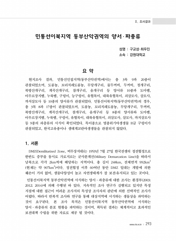 Ⅱ. 조사결과 www.nie.re.kr ? 293 민통선이북지역 동부산악권역의 양서 ? 파충류 성명 구교성·최우진 소속 강원대학교 요 약 현지조사 결과, 민통선인접지역 동부산악권역 에서는 총 3목 9과 20종이 관찰되었으며, 도롱뇽, 꼬리치레도롱뇽, 무당개구리, 물두꺼비, 두꺼비, 청개구리, 북방산개구리, 계곡산개구리, 참개구리, 옴개구리 등 양서류 10종과 도마뱀, 아무르장지뱀, 누룩뱀, 구렁이, 능구렁이, 유혈목이, 대륙유혈목이, 쇠살모사, 살모사, 까치살모사 등 10종의 양서류가 관찰되었다. 민통선이북지역 동부산악권역 의 경우, 총 3목 8과 17종이 관찰되었으며, 도롱뇽, 꼬리치레도롱뇽, 무당개구리, 두꺼비, 북방산개구리, 계곡산개구리, 참개구리, 옴개구리 등 8종의 양서류와 도마뱀, 아무르장지뱀, ...