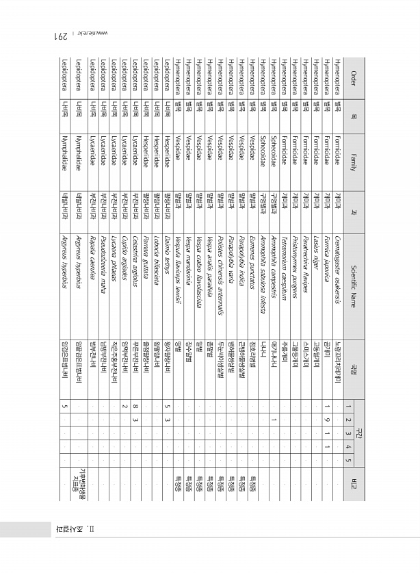 291 Order 목 Family 과 Scientific Name 국명 구간 비고 1 2 3 4 5 Hymenoptera 벌목 Formicidae 개미과 Crematogaster osakensis 노랑꼬리치레개미 Hymenoptera 벌목 Formicidae 개미과 Formica japonica 곰개미 1 9 1 1 Hymenoptera 벌목 Formicidae 개미과 Lasius niger 고동털개미 Hymenoptera 벌목 Formicidae 개미과 Paratrechina flavipes 스미스개미 Hymenoptera 벌목 Formicidae 개미과 Pristomyrmex pungens 그물등개미 Hymeno...