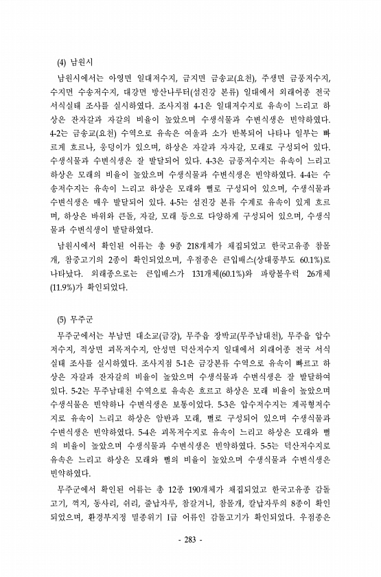 283 4 남원시 남원시에서는 아영면 일대저수지, 금지면 금송교 요천 , 주생면 금풍저수지, 수지면 수송저수지, 대강면 방산나루터 섬진강 본류 일대에서 외래어종 전국 서식실태 조사를 실시하였다. 조사지점 4-1은 일대저수지로 유속이 느리고 하 상은 잔자갈과 자갈의 비율이 높았으며 수생식물과 수변식생은 빈약하였다. 4-2는 금송교 요천 수역으로 유속은 여울과 소가 반복되어 나타나 일부는 빠 르게 흐르나, 웅덩이가 있으며, 하상은 자갈과 자자갈, 모래로 구성되어 있다. 수생식물과 수변식생은 잘 발달되어 있다. 4-3은 금풍저수지는 유속이 느리고 하상은 모래의 비율이 높았으며 수생식물과 수변식생은 빈약하였다. 4-4는 수 송저수지는 유속이 느리고 하상은 모래와 뻘로 구성되어 있으며, 수생식물과 수변식생은 매우 발...