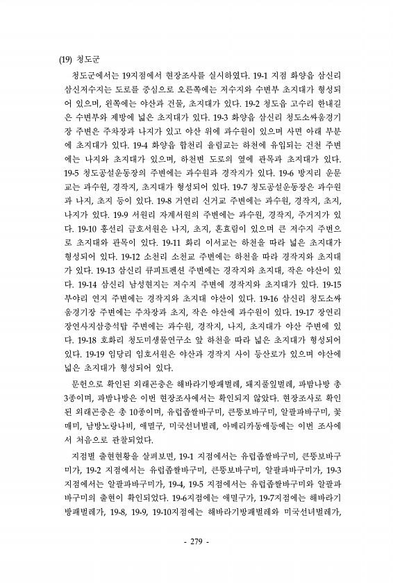 19 청도군 청도군에서는 19지점에서 현장조사를 실시하였다. 19-1 지점 화양읍 삼신리 삼신저수지는 도로를 중심으로 오른쪽에는 저수지와 수변부 초지대가 형성되 어 있으며, 왼쪽에는 야산과 건물, 초지대가 있다. 19-2 청도읍 고수리 한내길 은 수변부와 제방에 넓은 초지대가 있다. 19-3 화양읍 삼신리 청도소싸움경기 장 주변은 주차장과 나지가 있고 야산 위에 과수원이 있으며 사면 아래 부분 에 초지대가 있다. 19-4 화양읍 합천리 율림교는 하천에 유입되는 건천 주변 에는 나지와 초지대가 있으며, 하천변 도로의 옆에 관목과 초지대가 있다. 19-5 청도공설운동장의 주변에는 과수원과 경작지가 있다. 19-6 방지리 운문 교는 과수원, 경작지, 초지대가 형성되어 있다. 19-7 청도공설운동장은 과수원 과 나...