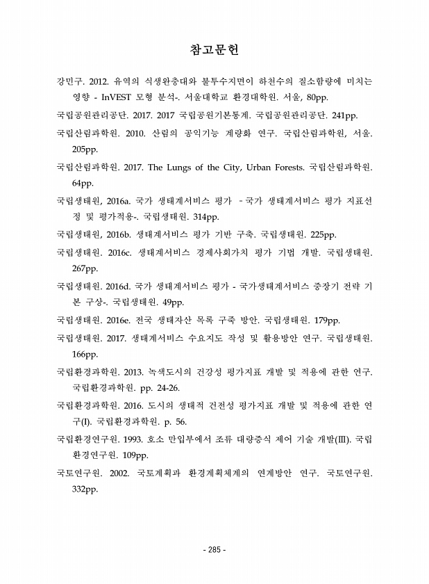 참고문헌 강민구. 2012. 유역의 식생완충대와 불투수지면이 하천수의 질소함량에 미치는 영향 InVEST 모형 분석-. 서울대학교 환경대학원. 서울, 80pp. 국립공원관리공단. 2017. 2017 국립공원기본통계. 국립공원관리공단. 241pp. 국립산림과학원. 2010. 산림의 공익기능 계량화 연구. 국립산림과학원, 서울. 205pp. 국립산림과학원. 2017. The Lungs of the City, Urban Forests. 국립산림과학원. 64pp. 국립생태원, 2016a. 국가 생태계서비스 평가 ?국가 생태계서비스 평가 지표선 정 및 평가적용-. 국립생태원. 314pp. 국립생태원, 2016b. 생태계서비스 평가 기반 구축. 국립생태원. 225pp. 국립생태원. 2016c. 생태계서비스 경제사회가치...