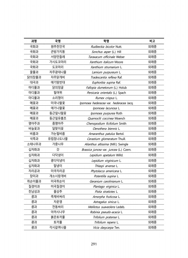 291 과명 국명 학명 비고 국화과 원추천인국 Rudbeckia bicolor Nutt. 외래종 국화과 큰방가지똥 Sonchus asper L. Hill 외래종 국화과 서양민들레 Taraxacum officinale Weber 외래종 국화과 가시도꼬마리 Xanthium italicum Moore 외래종 국화과 도꼬마리 Xanthium strumarium L. 외래종 꿀풀과 자주광대나물 Lamium purpureum L. 외래종 닭의장풀과 자주닭개비 Tradescantia reflexa Raf. 외래종 대극과 애기땅빈대 Euphorbia supina Raf. 외래종 마디풀과 닭의덩굴 Fallopia dumetorum L. Holub 외래종 마디풀과 털여뀌 Persicaria orientalis L. Spach...