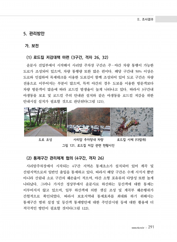 Ⅱ. 조사결과 www.nie.re.kr ? 291 5. 관리방안 가. 보전 1 로드킬 저감대책 마련 3구간, 격자 26, 32 운문사 진입부에서 시작해서 사리암 주차장 구간은 주·야간 차량 통행이 가능한 도로가 조성되어 있으며, 차량 통행량 또한 많은 편이다. 해당 구간내 50% 이상은 도로와 인접하여 목제데크를 이용한 도보길이 함께 조성되어 있어 도로 구간은 차량 전용으로 이루어지는 부분이 많으며, 특히 야간의 경우 도보를 이용한 방문객보다 차량 방문객이 많음에 따라 로드킬 발생율이 높게 나타나고 있다. 따라서 3구간내 야생동물 보호 및 로드킬 주의 안내판 설치와 같은 야생동물 로드킬 저감을 위한 안내시설 설치가 필요할 것으로 판단된다 그림 121 도로 조성 사리암 주자창내 차량 로드킬 사체 다람쥐 그림 ...