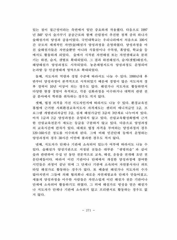 271 있는 점이 접근성이라는 측면에서 일단 중요하게 작용했다. 다음으로 1997 년 IMF 당시 숲가꾸기 공공근로와 함께 산림청이 추진한 정책 중의 하나가 숲해설가의 양성과 공용이었다. 국민대학교는 우리나라에서 처음으로 100시 간 규모의 체계적인 자연 숲 해설가 양성과정을 운영하였다. 양성과정을 마 친 숲해설가들은 자연숲뿐만 아니라 식물원이나 수목원, 휴양림, 학교숲 등 에서도 활동하게 되었다. 숲에서 시작된 자연해설 또는 자연생태교육 분위 기는 하천, 습지, 갯벌로 확대되었다. 그 결과 하천해설가, 습지 갯벌 해설가, 해양해설가 양성과정도 시작되었다. 농촌체험지도사 양성과정도 운영되어 논과밭 등 인공생태계 영역으로 확대되었다. 둘째, 지도자의 역량과 경험 수준에 따라서도 나눌 수 있다. 1990년대 후...