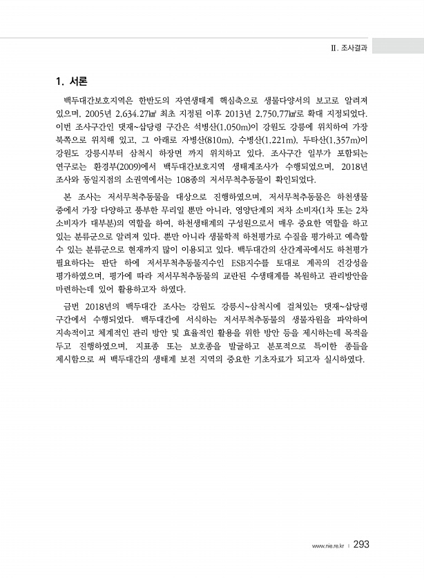 Ⅱ. 조사결과 www.nie.re.kr ? 293 1. 서론 백두대간보호지역은 한반도의 자연생태계 핵심축으로 생물다양서의 보고로 알려져 있으며, 2005년 2,634.27㎢ 최초 지정된 이후 2013년 2,750,77㎢로 확대 지정되었다. 이번 조사구간인 댓재삽당령 구간은 석병산 1,050m 이 강원도 강릉에 위치하여 가장 북쪽으로 위치해 있고, 그 아래로 자병산 810m , 수병산 1,221m , 두타산 1,357m 이 강원도 강릉시부터 삼척시 하장면 까지 위치하고 있다. 조사구간 일부가 포함되는 연구로는 환경부 2009 에서 백두대간보호지역 생태계조사가 수행되었으며, 2018년 조사와 동일지점의 소권역에서는 108종의 저서무척추동물이 확인되었다. 본 조사는 저서무척추동물을 대상으로 진행하였으며, 저서무척...