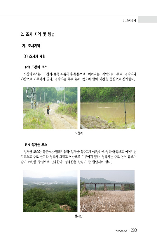 Ⅱ. 조사결과 www.nie.re.kr ? 293 2. 조사 지역 및 방법 가. 조사지역 1 조사지 개황 가 도창리 코스 도창리코스는 도창리-유곡교-유곡리-통문으로 이어지는 지역으로 주로 경작지와 야산으로 이루어져 있다. 경작지는 주로 논이 많으며 밭이 야산을 중심으로 산재한다. 도창리 나 성재산 코스 성재산 코스는 통문-op-얼레지쉼터-성재산-성주고개-생창리-암정리-용양보로 이어지는 지역으로 주로 산지와 경작지 그리고 야산으로 이루어져 있다. 경작지는 주로 논이 많으며 밭이 야산을 중심으로 산재한다. 성재산은 산림이 잘 발달되어 있다.성재산