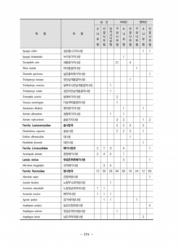 276 학 명 국 명 남 산 지리산 한라산 소 나 무 림 신 갈 나 무 림 아카시나무림 구 상 나 무 림 소 나 무 림 신 갈 나 무 림 구 상 나 무 림 소 나 무 림 신 갈 나 무 림 Synegia esther 검은톱니가지나방 1 1 Synegia limitatoides 녹두빛가지나방 1 Taeniophila unio 세줄흰가지나방 21 4 Thera variata 머리물결자나방 1 Timandra apicirosea 넓은홍띠애기자나방 1 Trichopteryx hemana 뒷잔날개물결자나방 1 Trichopteryx ussurica 얼룩무늬잔날개물결자나방 1 Trichopteryx ustata 검은띠잔날개물결자나방 1 Tristrophis veneris 범제비가지나방 2 Venusia semistrig...