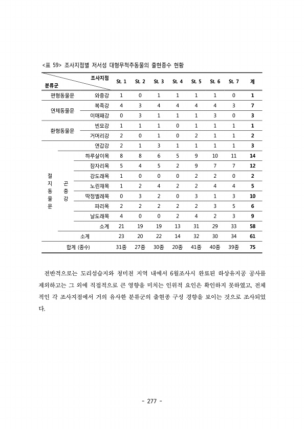 277 조사지점 분류군 St. 1 St. 2 St. 3 St. 4 St. 5 St. 6 St. 7 계 편형동물문 와충강 1 0 1 1 1 1 0 1 연체동물문 복족강 4 3 4 4 4 4 3 7 이매패강 0 3 1 1 1 3 0 3 환형동물문 빈모강 1 1 1 0 1 1 1 1 거머리강 2 0 1 0 2 1 1 2 절 지 동 물 문 연갑강 2 1 3 1 1 1 1 3 곤 충 강 하루살이목 8 8 6 5 9 10 11 14 잠자리목 5 4 5 2 9 7 7 12 강도래목 1 0 0 0 2 2 0 2 노린재목 1 2 4 2 2 4 4 5 딱정벌레목 0 3 2 0 3 1 3 10 파리목 2 2 2 2 2 3 5 6 날도래목 4 0 0 2 4 2 3 9 소계 21 19 19 13 31 29 33 58 소계 23 2...