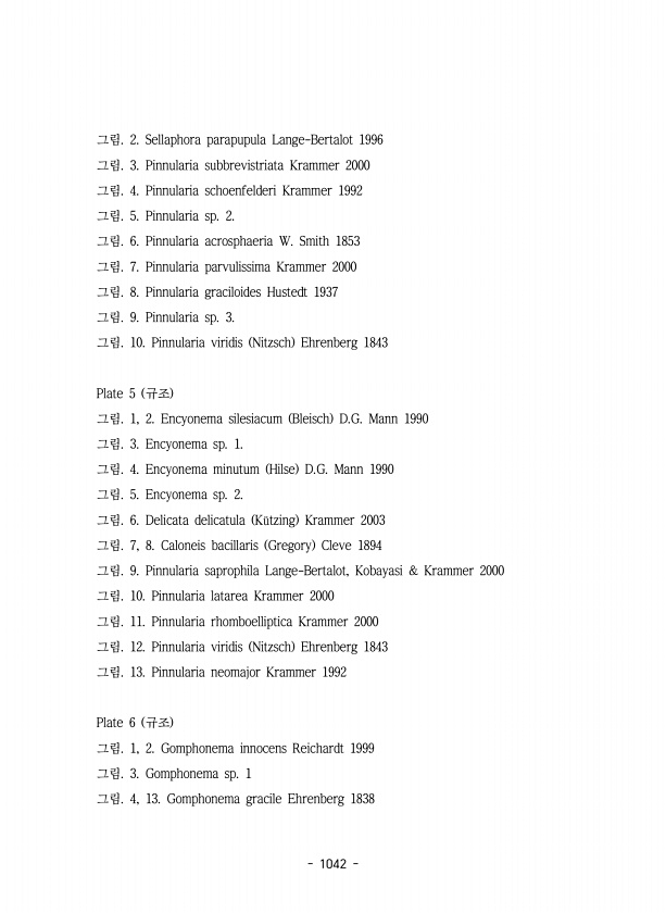 1042 그림. 2. Sellaphora parapupula Lange-Bertalot 1996 그림. 3. Pinnularia subbrevistriata Krammer 2000 그림. 4. Pinnularia schoenfelderi Krammer 1992 그림. 5. Pinnularia sp. 2. 그림. 6. Pinnularia acrosphaeria W. Smith 1853 그림. 7. Pinnularia parvulissima Krammer 2000 그림. 8. Pinnularia graciloides Hustedt 1937 그림. 9. Pinnularia sp. 3. 그림. 10. Pinnularia viridis Nitzsch Ehrenberg 1843 Plate 5 규조 그림. 1, 2. E...