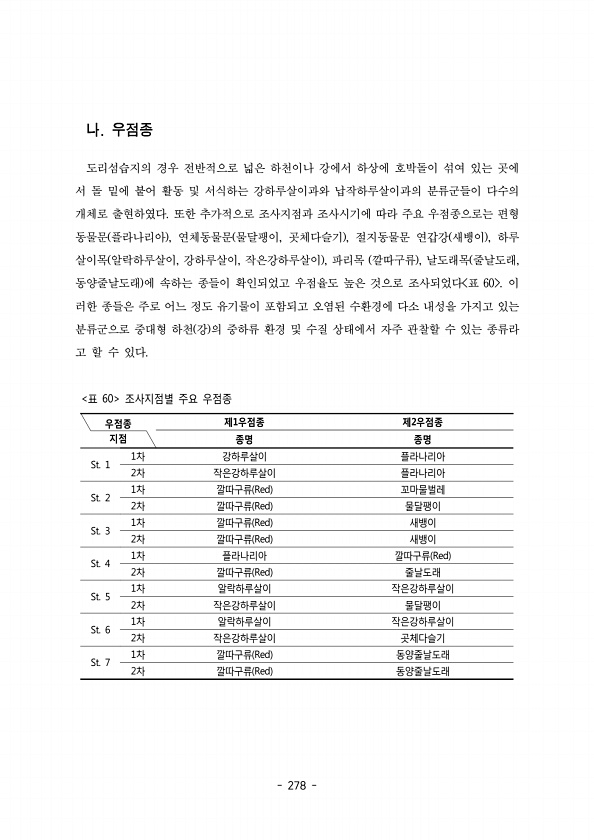 278 도리섬습지의 경우 전반적으로 넓은 하천이나 강에서 하상에 호박돌이 섞여 있는 곳에 서 돌 밑에 붙어 활동 및 서식하는 강하루살이과와 납작하루살이과의 분류군들이 다수의 개체로 출현하였다 또한 추가적으로 조사지점과 조사시기에 따라 주요 우점종으로는 편형 동물문 플라나리아 연체동물문 물달팽이 곳체다슬기 절지동물문 연갑강 새뱅이 하루 , , , , 살이목 알락하루살이 강하루살이 작은강하루살이 파리목 깔따구류 날도래목 줄날도래 , , , , , 동양줄날도래 에 속하는 종들이 확인되었고 우점율도 높은 것으로 조사되었다 표 이 60 러한 종들은 주로 어느 정도 유기물이 포함되고 오염된 수환경에 다소 내성을 가지고 있는 분류군으로 중대형 하천 강 의 중하류 환경 및 수질 상태에서 자주 관찰할 수 있는 종류라 고 할...