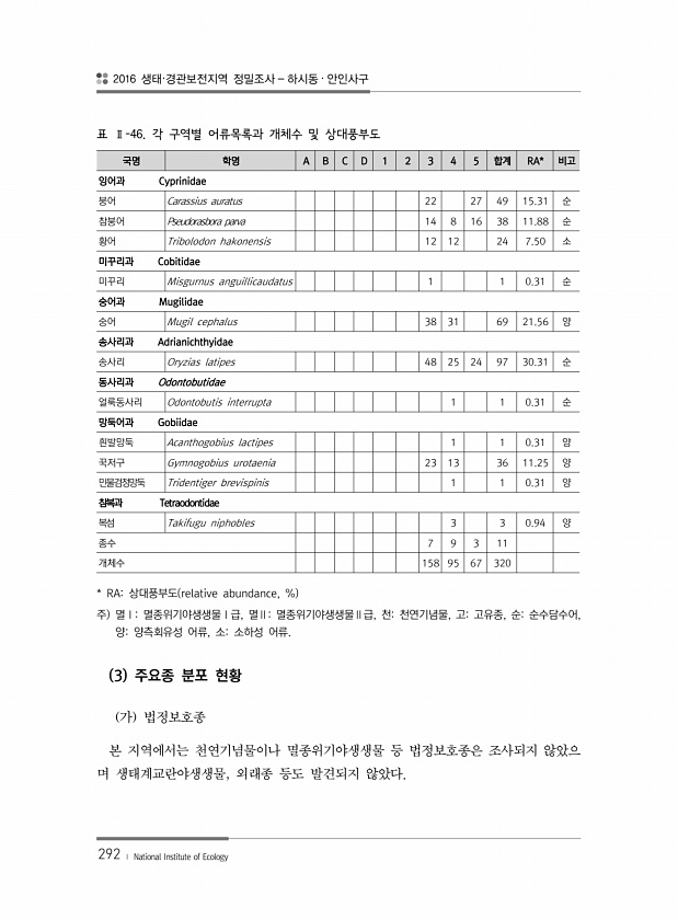 2016 생태·경관보전지역 정밀조사 하시동 · 안인사구 292 ? National Institute of Ecology 국명 학명 A B C D 1 2 3 4 5 합계 RA* 비고 잉어과 Cyprinidae 붕어 Carassius auratus 22 27 49 15.31 순 참붕어 Pseudorasbora parva 14 8 16 38 11.88 순 황어 Tribolodon hakonensis 12 12 24 7.50 소 미꾸리과 Cobitidae 미꾸리 Misgurnus anguillicaudatus 1 1 0.31 순 숭어과 Mugilidae 숭어 Mugil cephalus 38 31 69 21.56 양 송사리과 Adrianichthyidae 송사리 Oryzias latipes 48 25 24 97 30...