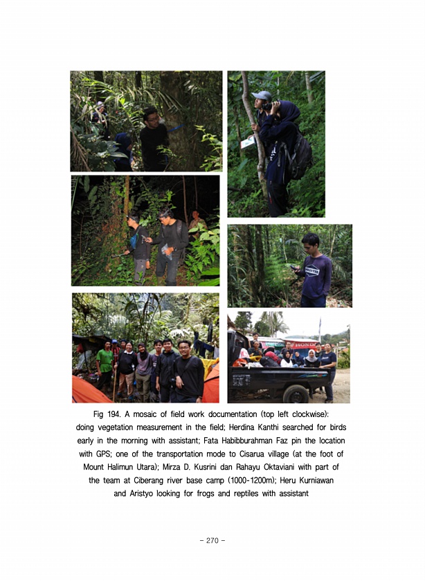 Fig 194. A mosaic of field work documentation top left clockwise doing vegetation measurement in the field; Herdina Kanthi searched for birds early in the morning with assistant; Fata Habibburahman Faz pin the location with GPS; one of the transportation mode to Cisarua village at the foot of Mount Halimun Utara ; Mirza D. Kusrini dan Rahayu Oktaviani with part of the team at Ciberang river base c...