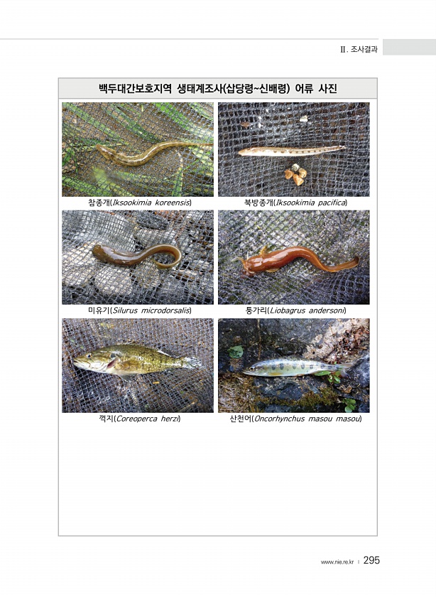 Ⅱ. 조사결과 www.nie.re.kr ? 295 백두대간보호지역 생태계조사 삽당령신배령 어류 사진 참종개 Iksookimia koreensis 북방종개 Iksookimia pacifica 미유기 Silurus microdorsalis 퉁가리 Liobagrus andersoni 꺽지 Coreoperca herzi 산천어 Oncorhynchus masou masou
