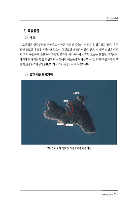II. 조사결과 www.nie.re.kr ?289 5 호감섬은 행정구역상 전라남도 신안군 증도면 방축리 산 332 에 위치하고 있다. 유인 도인 증도와 가깝게 위치하고 있으며, 무인도인 대섬과 인접해 있다. 섬 내부 식생은 대섬 과 거의 동일하게 분포하며 다양한 조류가 서식하기에 빈약한 모습을 보였다. 지형에서 해식애와 해식노치 등의 발달과 식생에서 해송군락과 자금우 서식, 양서·파충류에서 구 렁이 멸종위기야생생물Ⅱ 의 서식으로 특정도서로 지정되었다. 그림 55. 조사 경로 및 법정보호종관찰지점