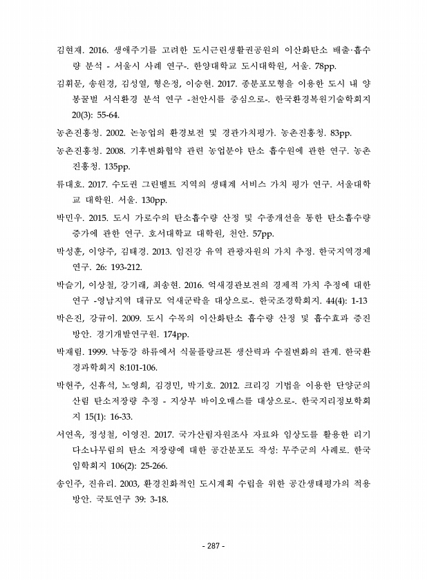 김현재. 2016. 생애주기를 고려한 도시근린생활권공원의 이산화탄소 배출·흡수 량 분석 서울시 사례 연구-. 한양대학교 도시대학원, 서울. 78pp. 김휘문, 송원경, 김성열, 형은정, 이승현. 2017. 종분포모형을 이용한 도시 내 양 봉꿀벌 서식환경 분석 연구 -천안시를 중심으로-. 한국환경복원기술학회지 20 3 55-64. 농촌진흥청. 2002. 논농업의 환경보전 및 경관가치평가. 농촌진흥청. 83pp. 농촌진흥청. 2008. 기후변화협약 관련 농업분야 탄소 흡수원에 관한 연구. 농촌 진흥청. 135pp. 류대호. 2017. 수도권 그린벨트 지역의 생태계 서비스 가치 평가 연구. 서울대학 교 대학원. 서울. 130pp. 박민우. 2015. 도시 가로수의 탄소흡수량 산정 및 수종개선을 통한 탄소흡수량 증...