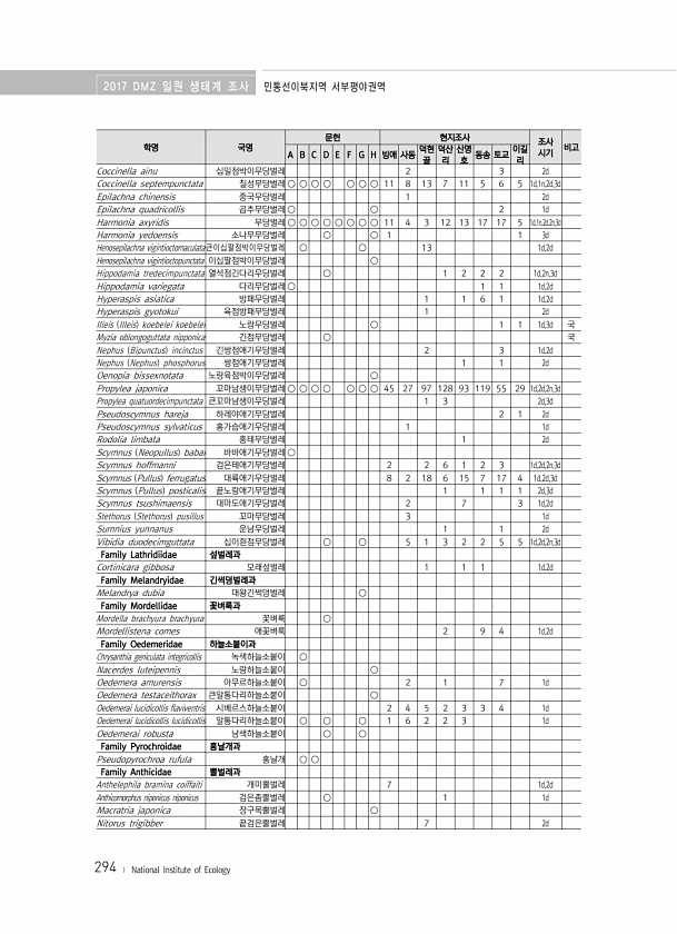 2017 DMZ 일원 생태계 조사 민통선이북지역 서부평야권역 294 ? National Institute of Ecology 학명 국명 문헌 현지조사 조사 A B C D E F G H 빙애 사동 덕현 시기 비고 골 덕산 리 산명 호 동송 토교 이길 리 Coccinella ainu 십일점박이무당벌레 2 3 2d Coccinella septempunctata 칠성무당벌레 ○ ○ ○ ○ ○ ○ ○ 11 8 13 7 11 5 6 5 1d,1n,2d,3d Epilachna chinensis 중국무당벌레 1 2d Epilachna quadricollis 곱추무당벌레 ○ ○ 2 1d Harmonia axyridis 무당벌레 ○ ○ ○ ○ ○ ○ ○ ○ 11 4 3 12 13 17 17 5 1d,1n,2d,2n,3d Ha...
