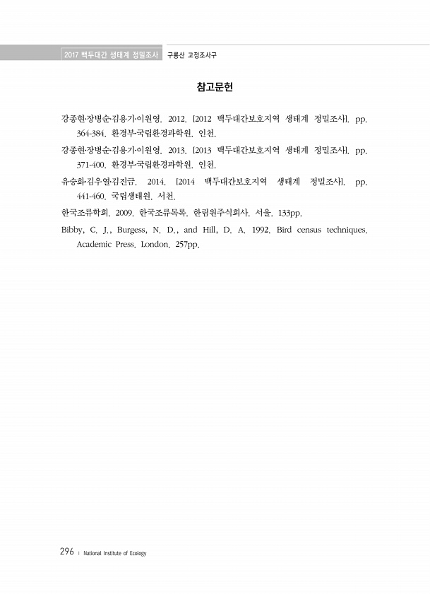 2017 백두대간 생태계 정밀조사 구룡산 고정조사구 296 ? National Institute of Ecology 참고문헌 강종현?장병순?김용기?이원영. 2012. [2012 백두대간보호지역 생태계 정밀조사]. pp. 364-384. 환경부?국립환경과학원. 인천. 강종현?장병순?김용기?이원영. 2013. [2013 백두대간보호지역 생태계 정밀조사]. pp. 371-400. 환경부?국립환경과학원. 인천. 유승화?김우열?김진금. 2014. [2014 백두대간보호지역 생태계 정밀조사]. pp. 441-460. 국립생태원. 서천. 한국조류학회. 2009. 한국조류목록. 한림원주식회사. 서울. 133pp. Bibby, C. J., Burgess, N. D., and Hill, D. A. 1992. Bird cens...