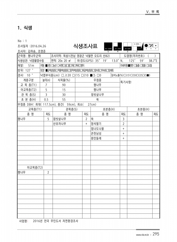 Ⅴ. 부 록 www.nie.re.kr ? 295 1. 식생 No 1 조사일자 2016.04.26 조사자김하송, 조영준 식생조사표 군락명팽나무군락 조사지역목섬1 전남 영광군 낙월면 오도리 산82 도엽명 격자번호 식생상관낙엽활엽수림 면적20x 20 ㎡ 위?경도 GPS 35° 19′ 13.0″N, 125° 59′ 38.7E 해발51m 지형■산정 □능선 □사면 □상□중□하 □계곡□평지 미세지형■평면 □돌출 □함몰 □요철 방위127 ° 토양■갈색삼림토□적황색삼림토□암적색삼림토□회갈색삼림토□침식토□미숙토□암쇄토 경사10 ° 낙엽부식층 cm □.≥20 □ 15 □ 10 ■ 5 □0 암석노출 % □≥51□ 50□ 25□ 5■0 계층구분 높이 m 식피율 % 우점종 특기사항교 목 층 T1 7 90 팽나무 아교목층 T2 5 1...