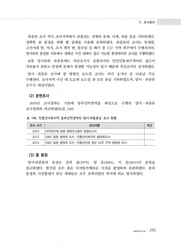 Ⅱ. 조사결과 www.nie.re.kr ? 295 파충류 조사 역시 조사지역에서 관찰되는 성체와 유체, 사체, 허물 등을 기록하였다. 정확한 종 동정을 위해 뱀 집게를 사용해 포획하였다. 파충류의 조사는 묵정밭, 고산지대 밭, 야지, 초지 계곡 변, 돌무덤 등 해가 잘 드는 지역 위주에서 수행되지만, 양서류와 동일한 이유에서 정해진 구간 내에서 접근 가능한 환경에서만 조사를 수행하였다. 보통 양서류와 파충류에는 야간조사가 포함되지만 민간인통제구역이라 접근이 자유롭지 못하고 안정에 문제가 발생할 가능성이 있기 때문에 주간조사만 실시하였다. 양서·파충류 조사에 한 방법인 로드킬 조사는 비가 오거나 온 다음날 주로 수행된다. 조사지역 구간 내 도로에 로드킬 된 모든 종을 기록하였으며, 양서·파충류 모두가 대상이었...