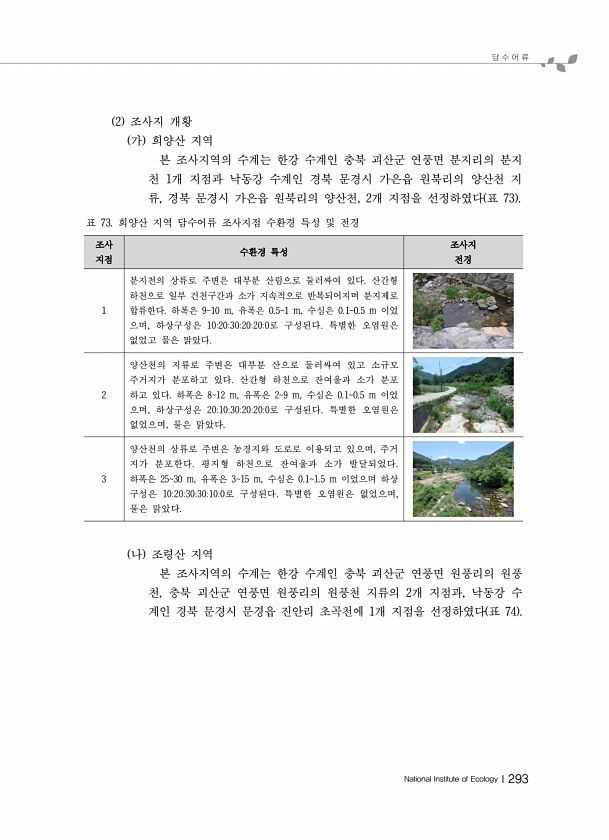 담 수 어 류 National Institute of EcologyⅠ293 2 조사지 개황 가 희양산 지역 본 조사지역의 수계는 한강 수계인 충북 괴산군 연풍면 분지리의 분지 천 1개 지점과 낙동강 수계인 경북 문경시 가은읍 원북리의 양산천 지 류, 경북 문경시 가은읍 원북리의 양산천, 2개 지점을 선정하였다 표 73 표 73. 희양산 지역 담수어류 조사지점 수환경 특성 및 전경 조사 지점 수환경 특성 조전사경지 1 분지천의 상류로 주변은 대부분 산림으로 둘러싸여 있다. 산간형 하천으로 일부 건천구간과 소가 지속적으로 반복되어지며 분지제로 합류한다. 하폭은 910 m, 유폭은 0.51 m, 수심은 0.10.5 m 이었 으며, 하상구성은 10203020200로 구성된다. 특별한 오염원은 없었고 물은 맑았다. ...