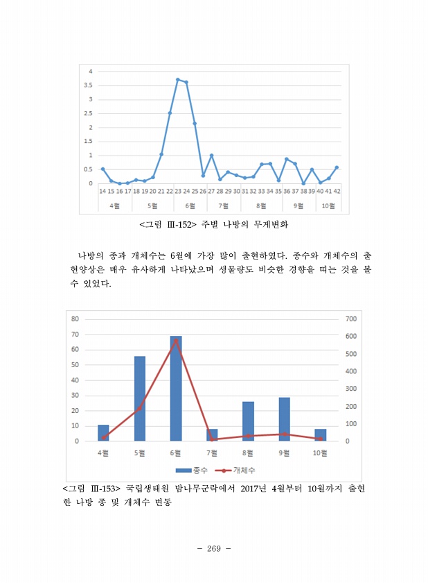 269 그림 Ⅲ-152 주별 나방의 무게변화 나방의 종과 개체수는 6월에 가장 많이 출현하였다. 종수와 개체수의 출 현양상은 매우 유사하게 나타났으며 생물량도 비슷한 경향을 띠는 것을 볼 수 있었다. 그림 Ⅲ-153 국립생태원 밤나무군락에서 2017년 4월부터 10월까지 출현 한 나방 종 및 개체수변동