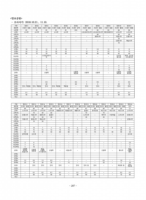 망포공원 조사시기2018.10.21., 11.10. 구분 망포1 망포2 망포3 망포4 망포5 망포6 망포7 망포8 망포9 망포10 망포11 중분류 조경수 침엽 조경수 침엽 조경수 침엽 조경수 침엽 조경수 침엽 조경수 관목 조경수 침엽 조경수 침엽 조경수 침엽 조경수 활엽 조경수 활엽 소분류 B1 B1 B1 B1 B1 B10 B2 B2 B3 B4 B4 교목1 소나무 소나무 소나무 소나무 소나무 스트로브잣나무 스트로브잣나무 메타세콰이어 느티나무 느티나무 교목1% 80 60 80 교목2 왕벚나무 이팝나무 단풍나무 교목2% 30 교목3 단풍나무 매실나무 교목3% 10 교목4 교목4% 교목H 10 13 12 9 15 7 3.5 13 8 8 교목D 24 27 25 20 25 12 8 23 13 15 교목% 80 70 ...