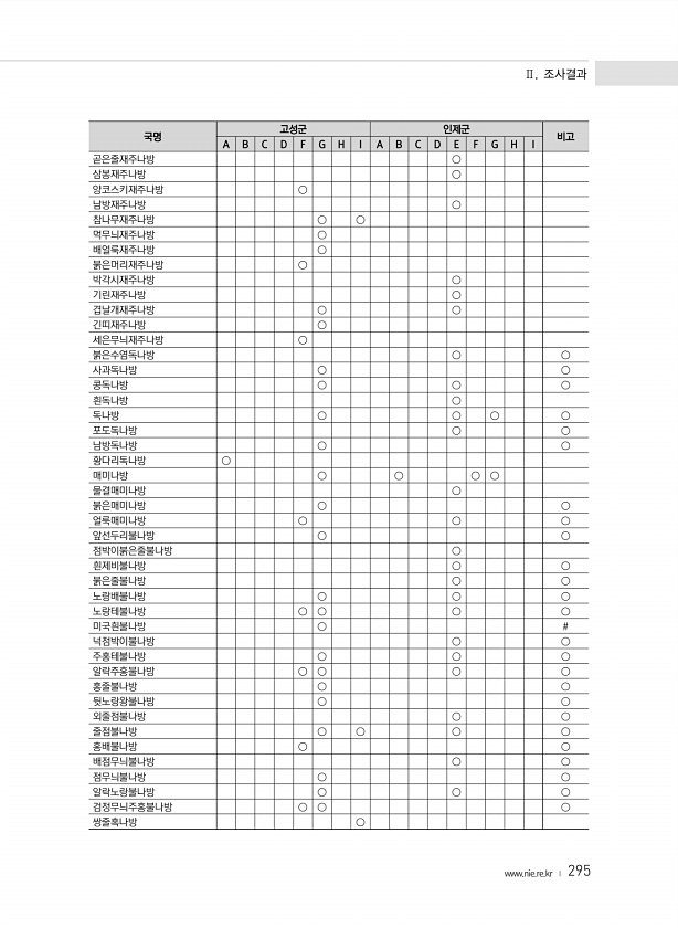 Ⅱ. 조사결과 www.nie.re.kr ? 295 국명 고성군 인제군 비고 A B C D F G H I A B C D E F G H I 곧은줄재주나방 ○ 삼봉재주나방 ○ 양코스키재주나방 ○ 남방재주나방 ○ 참나무재주나방 ○ ○ 먹무늬재주나방 ○ 배얼룩재주나방 ○ 붉은머리재주나방 ○ 박각시재주나방 ○ 기린재주나방 ○ 겹날개재주나방 ○ ○ 긴띠재주나방 ○ 세은무늬재주나방 ○ 붉은수염독나방 ○ ○ 사과독나방 ○ ○ 콩독나방 ○ ○ ○ 흰독나방 ○ 독나방 ○ ○ ○ ○ 포도독나방 ○ ○ 남방독나방 ○ ○ 황다리독나방 ○ 매미나방 ○ ○ ○ ○ 물결매미나방 ○ 붉은매미나방 ○ ○ 얼룩매미나방 ○ ○ ○ 앞선두리불나방 ○ ○ 점박이붉은줄불나방 ○ 흰제비불나방 ○ ○ 붉은줄불나방 ○ ○ 노랑배불나방 ○ ○ ○ 노랑테불나...