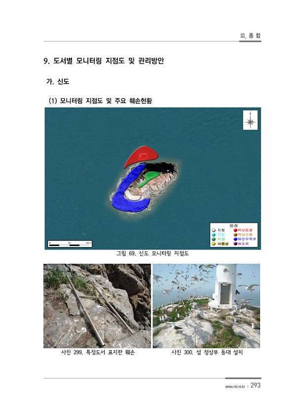 Ⅲ. 종 합 www.nie.re.kr ? 293 9. 도서별 모니터링 지점도 및 관리방안 가. 신도 1 모니터링 지점도 및 주요 훼손현황 그림 69. 신도 모니터링 지점도 사진 299. 특정도서 표지판 훼손 사진 300. 섬 정상부 등대설치