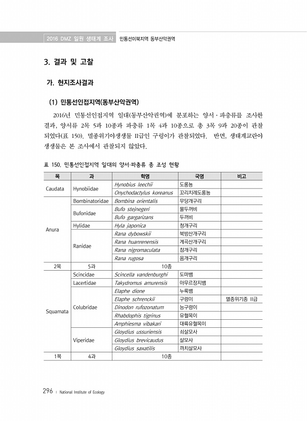 2016 DMZ 일원 생태계 조사 민통선이북지역 동부산악권역 296 ? National Institute of Ecology 3. 결과 및 고찰 가. 현지조사결과 1 민통선인접지역 동부산악권역 2016년 민통선인접지역 일대 동부산악권역 에 분포하는 양서·파충류를 조사한 결과, 양서류 2목 5과 10종과 파충류 1목 4과 10종으로 총 3목 9과 20종이 관찰 되었다 표 150 멸종위기야생생물 II급인 구렁이가 관찰되었다. 반면, 생태계교란야 생생물은 본 조사에서 관찰되지 않았다. 목 과 학명 국명 비고 Caudata Hynobiidae Hynobius leechii 도롱뇽 Onychodactylus koreanus 꼬리치레도롱뇽 Anura Bombinatoridae Bombina orientalis 무당개구...