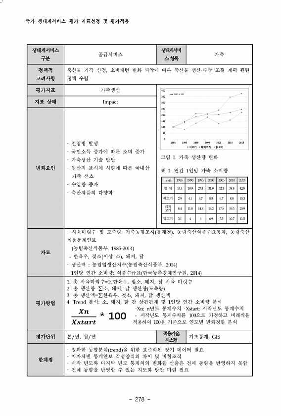 국가 생태계서비스 평가 지표선정 및 평가적용 278 생태계서비스 구분 공급서비스 생태계서비 스 항목 가축 정책적 고려사항 축산물 가격 산정, 소비패턴 변화 파악에 따른 축산물 생산·수급 조절 계획 관련 정책 수립 평가지표 가축생산 그림 1. 가축 생산량 변화 표 1. 연간 1인당 가축 소비량 구분 1985 1990 1995 2000 2005 2010 2013 합 계 14.4 19.9 27.4 31.9 32.1 38.8 42.8 쇠고기 2.9 4.1 6.7 8.5 6.7 8.8 10.3 돼지 고기 8.4 11.8 14.8 16.2 17.8 19.3 20.9 닭고기 3.1 4 6 6.9 7.5 10.7 11.5 지표 상태 Impact 변화요인 · 전염병 발생 · 국민소득 증가에 따른 소비 증가 · 가축생산 기술...
